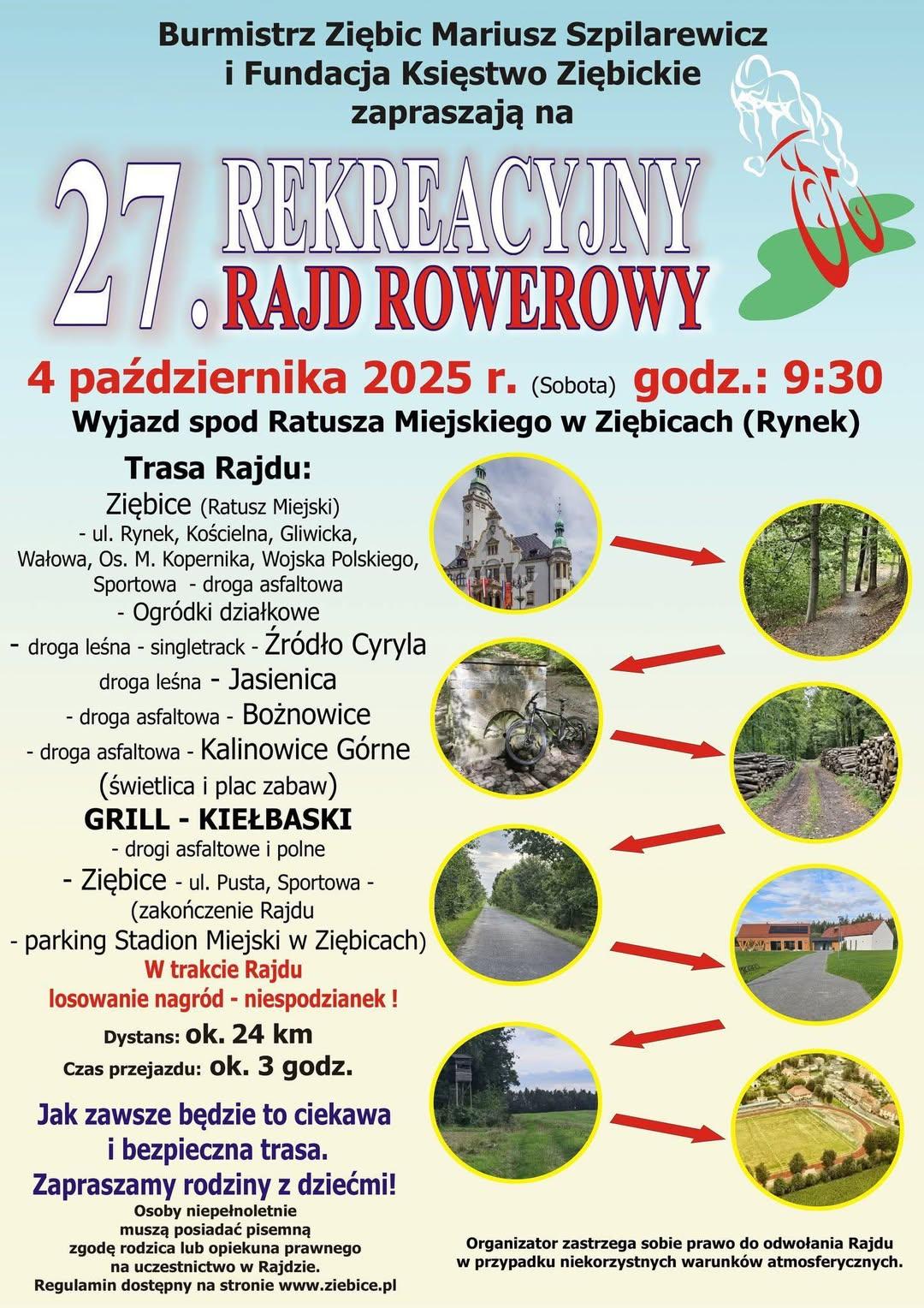 W sobotę, 4 października 2025 roku, wystartuje 27. Rekreacyjny Rajd Rowerowy w Ziębicach. To wydarzenie od lat przyciąga miłośników dwóch kółek, którzy wspólnie pokonują kilkudziesięciokilometrową trasę prowadzącą przez malownicze tereny gminy.