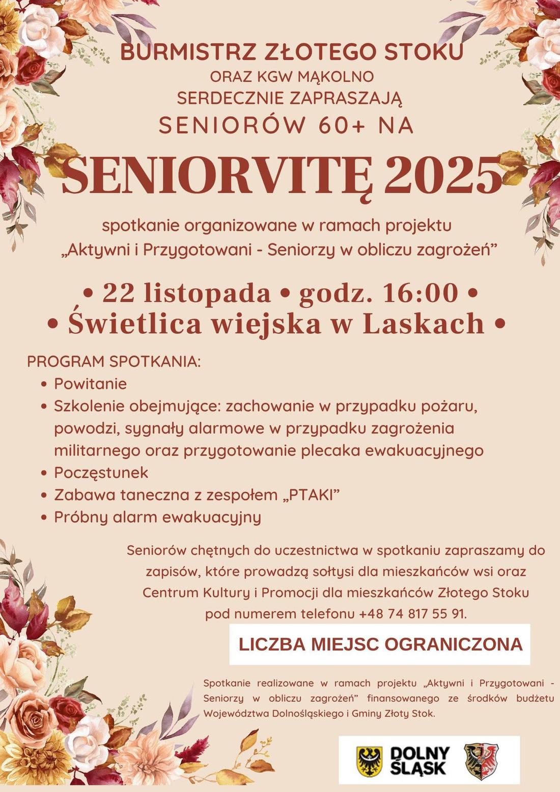 Już 22 listopada 2025 roku seniorzy z gminy Złoty Stok spotkają się na wyjątkowym wydarzeniu Seniorvita 2025, organizowanym w ramach projektu „Aktywni i Przygotowani – Seniorzy w obliczu zagrożeń”. Spotkanie odbędzie się o godz. 16:00 w świetlicy wiejskiej w Laskach.