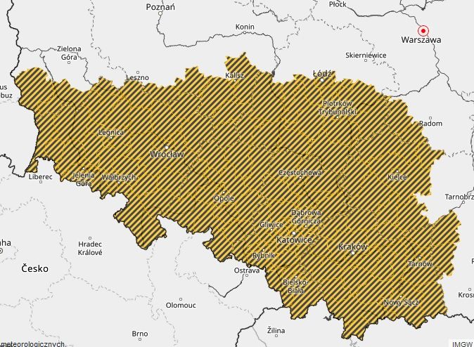 Synoptycy IMGW prognozują zamarzanie mokrej nawierzchni dróg i chodników po opadach deszczu ze śniegiem i mokrego śniegu powodujące ich oblodzenie. Temperatura minimalna od -2°C do 0°C, temperatura minimalna przy gruncie od -3°C do -1°C.