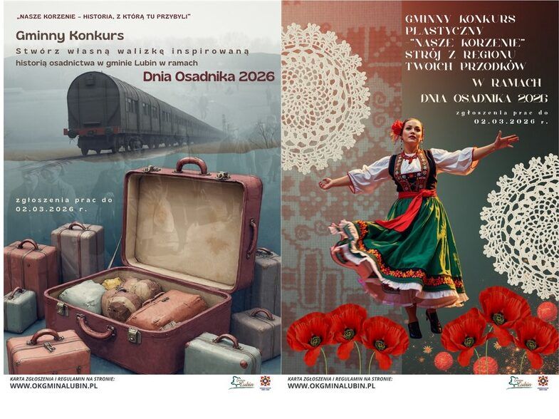 „Stwórz własną walizkę inspirowaną historią osadnictwa w gminie Lubin” to konkurs przestrzenny. Walizka ma symbolizować drogę, podróż i początek nowego życia. Może kryć w sobie wspomnienia, symbole, rodzinne historie i przedmioty, które budują opowieść o domu i tożsamości.
