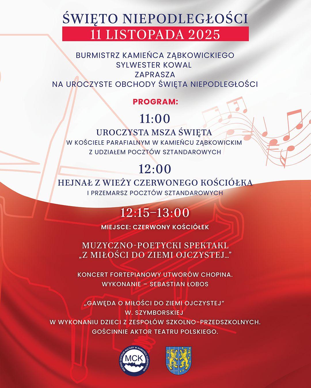 Obchody rozpoczną się tradycyjnie mszą świętą w kościele parafialnym w Kamieńcu Ząbkowickim. We mszy udział wezmą poczty sztandarowe. Punktualnie o godzinie 12 zabrzmi hejnał z wieży Czerwonego Kościołka, a kwadrans później uczestnicy wydarzeń będą mieli okazję obejrzeć muzyczno-poetycki spektakl „Z miłości do ziemi ojczystej”. Sebastian Łobos zagra najpiękniejsze utwory Chopina, a dzieci z zespołów szkolno-przedszkolnych wystąpią u boku aktorów Teatru Polskiego prezentując „Gawędę o miłości do ziemi ojczystej” Wisławy Szymborskiej.