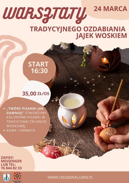 Ośrodek Kultury Gminy Lubin zaprasza mieszkańców na warsztaty w tradycyjnym tworzeniu pisanek. Wielkanoc coraz bliżej, warto poznać tajniki metody woskowej, a wasze pisanki zachwycą każdego!
