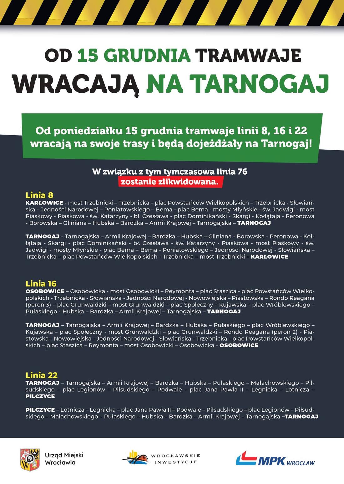 Wrocławskie Inwestycje przekazują dobre wiadomości dla mieszkańców Wrocławia, a w szczególności osiedla Tarnogaj. Od poniedziałku, 15 grudnia, tramwaje linii 8, 16 i 22 wracają na swoje trasy.