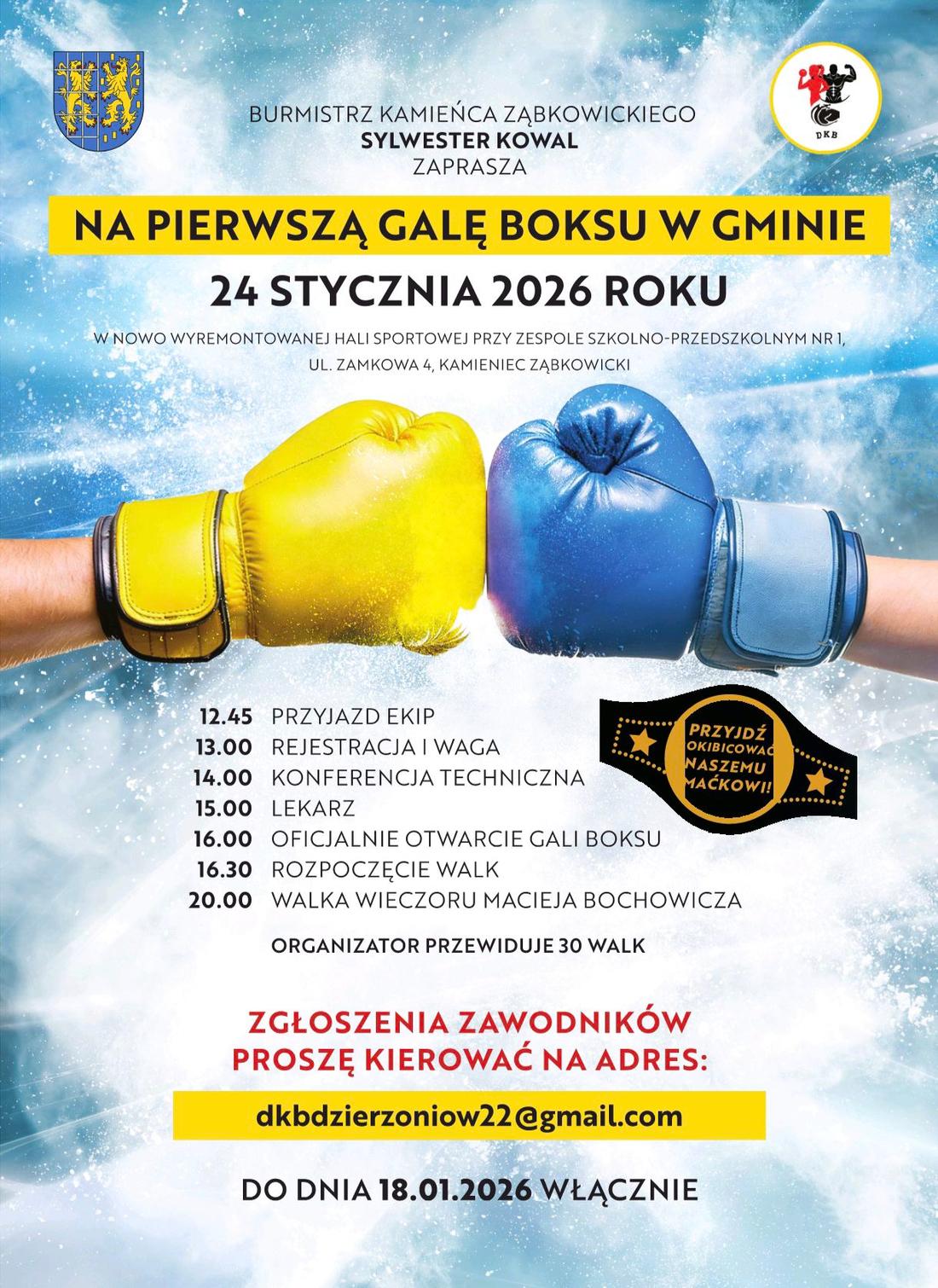 W najbliższą sobotę, 24 stycznia, zapraszamy do Kamieńca Ząbkowickiego na pierwszą Galę Boksu. Emocje sportowe na ringu gwarantowane!