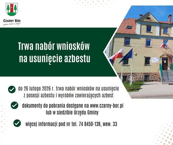 Do czwartku, 26 lutego, trwa nabór wniosków na usuwanie szkodliwego azbestu z posesji na terenie Gminy Czarny Bór. Mieszkańcy, którzy złożą pełną dokumentację będą mogli liczyć na wsparcie finansowe.