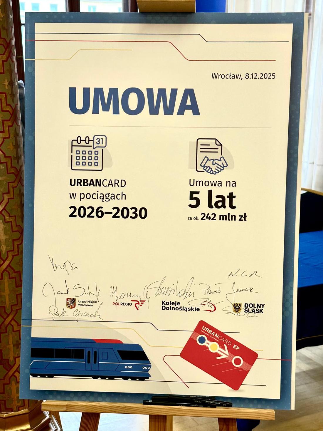 – Około 241,7 mln zł – tyle wynosi szacunkowa wartość nowej, pięcioletniej umowy (2026–2030) na honorowanie URBANCARD w pociągach Kolei Dolnośląskich i Polregio. To oznacza średnio 48,3 mln zł rocznie, które Wrocław przeznaczy na umożliwienie mieszkańcom korzystania z kolei w ramach biletów miejskich. Kontynuacja honorowania URBANCARD w pociągach to decyzja poprawiająca mobilność tysięcy mieszkańców – mówi Jacek Sutryk, prezydent Wrocławia.