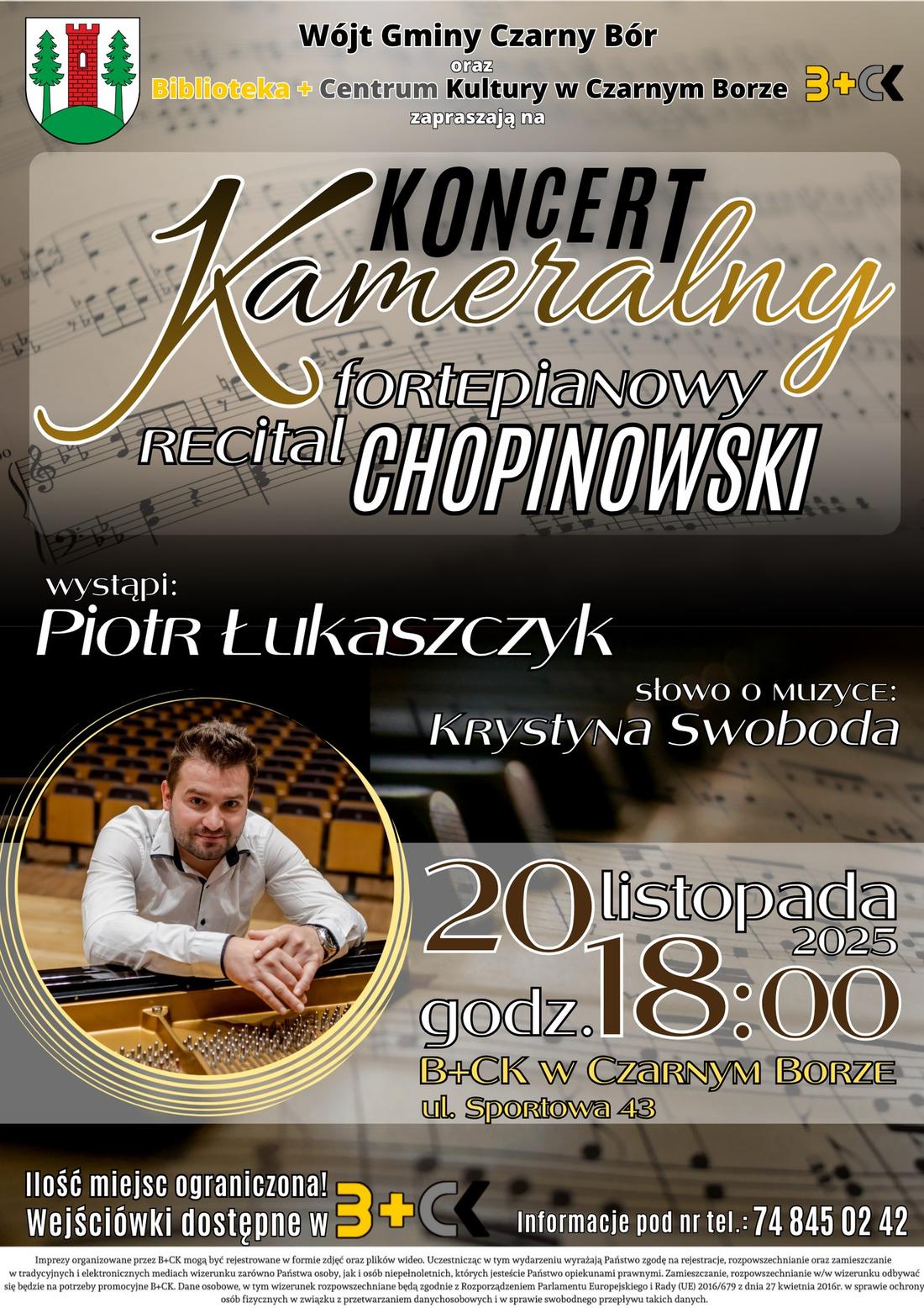 Władze Gminy Czarny Bór oraz Centrum Kultury w Czarnym Borze zapraszają mieszkańców na kameralny koncert – Recital Chopinowski w wykonaniu Piotra Łukaszczyka. Zapowiada się bardzo przyjemne popołudnie wypełnione piękną muzyką i wyjątkową atmosferą!